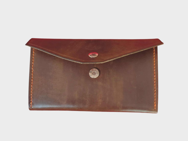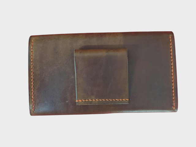 Pochette de ceinture réalisée dans un cuir bovin tannage végétal naturel teinté par mes soins coloris marron et entièrement cousu main par point sellier coloris orange.