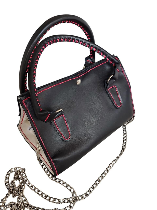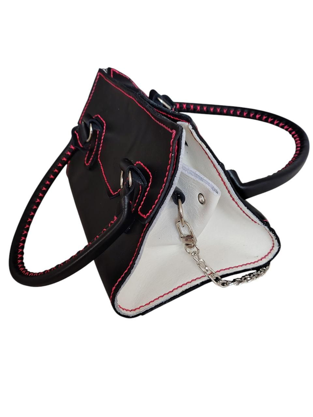 Il est réalisé dans un cuir de veau satynilis noir et un cuir de veau nappa blanc