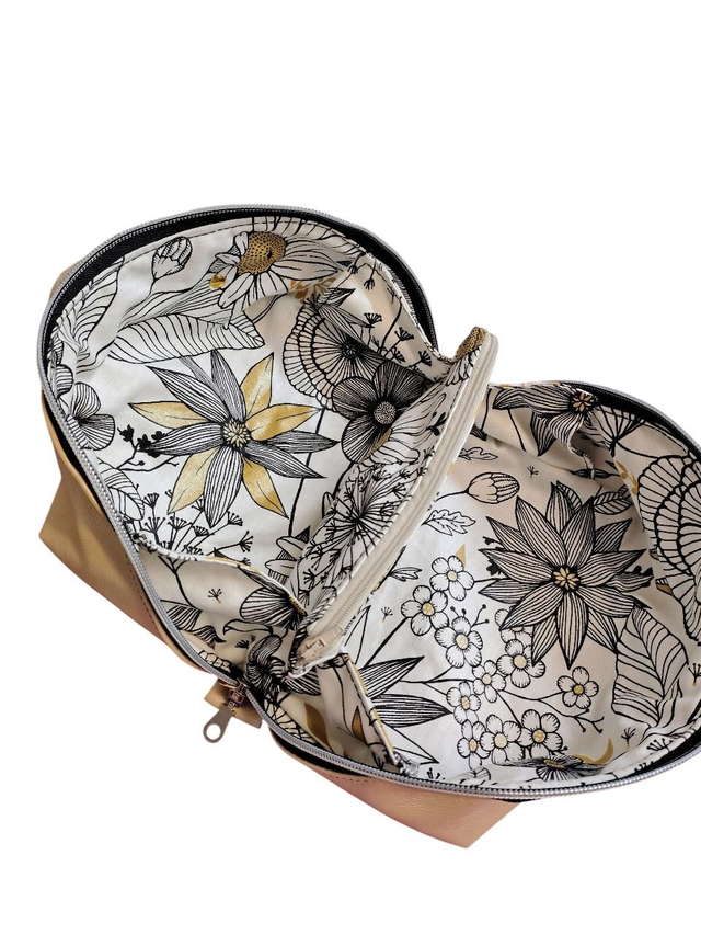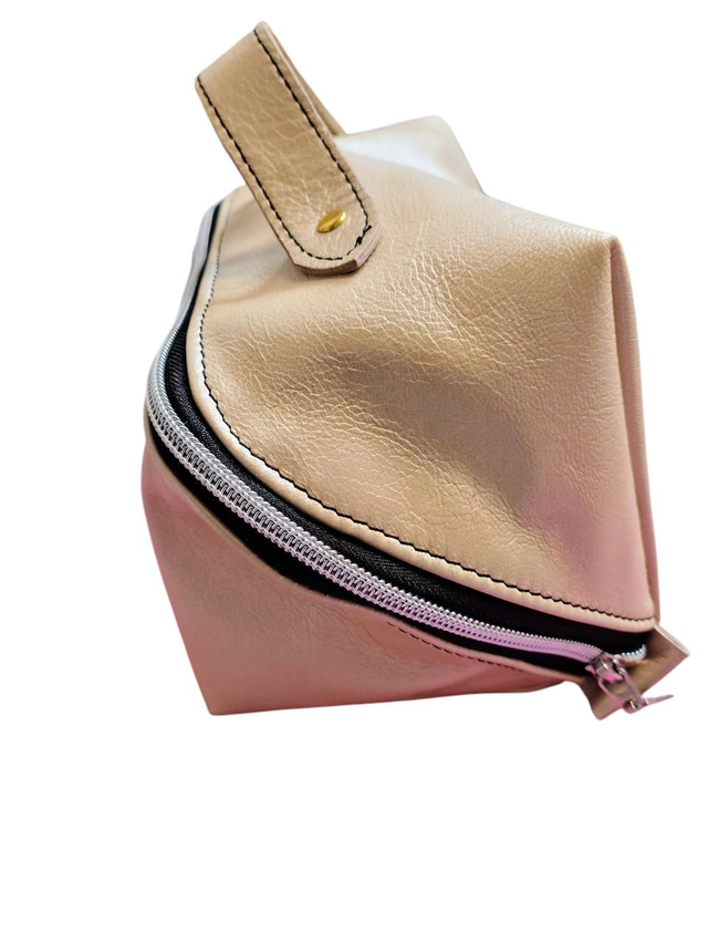 Grande trousse de toilette réalisée dans un cuir de chèvre nappa coloris perlé nacré doublé d'un tissu imprimé floral noir et or 109% coton.